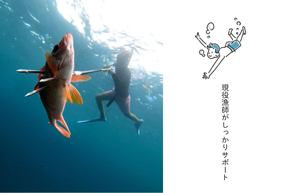 テレビで見たあの「獲ったどぉ~!」簡単に見えて難易度高めなんです!そんな、魚突き体験や、お子様向けの見釣りが楽しめるシュノーケリングコースもご用意!